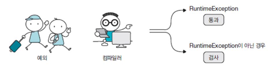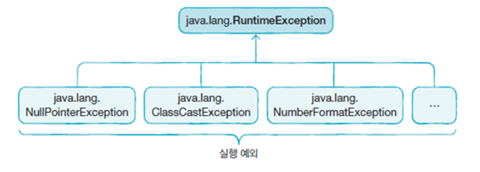 - 실행(runtime) 예외: 컴파일러가 체크하지 않는 예외로, 검사 없이 실행 시 예측 없이 갑자기 발생