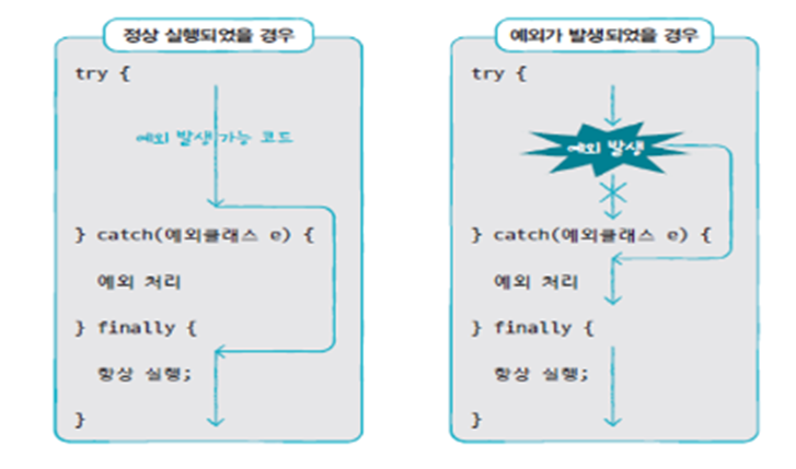 사용자의 잘못된 조작 또는 개발자의 잘못된 코딩으로 발생하는 프로그램 오류를 예외(exception)라고 하며, 예외 처리 프로그램으로 정상 실행 상태를 유지해야 한다