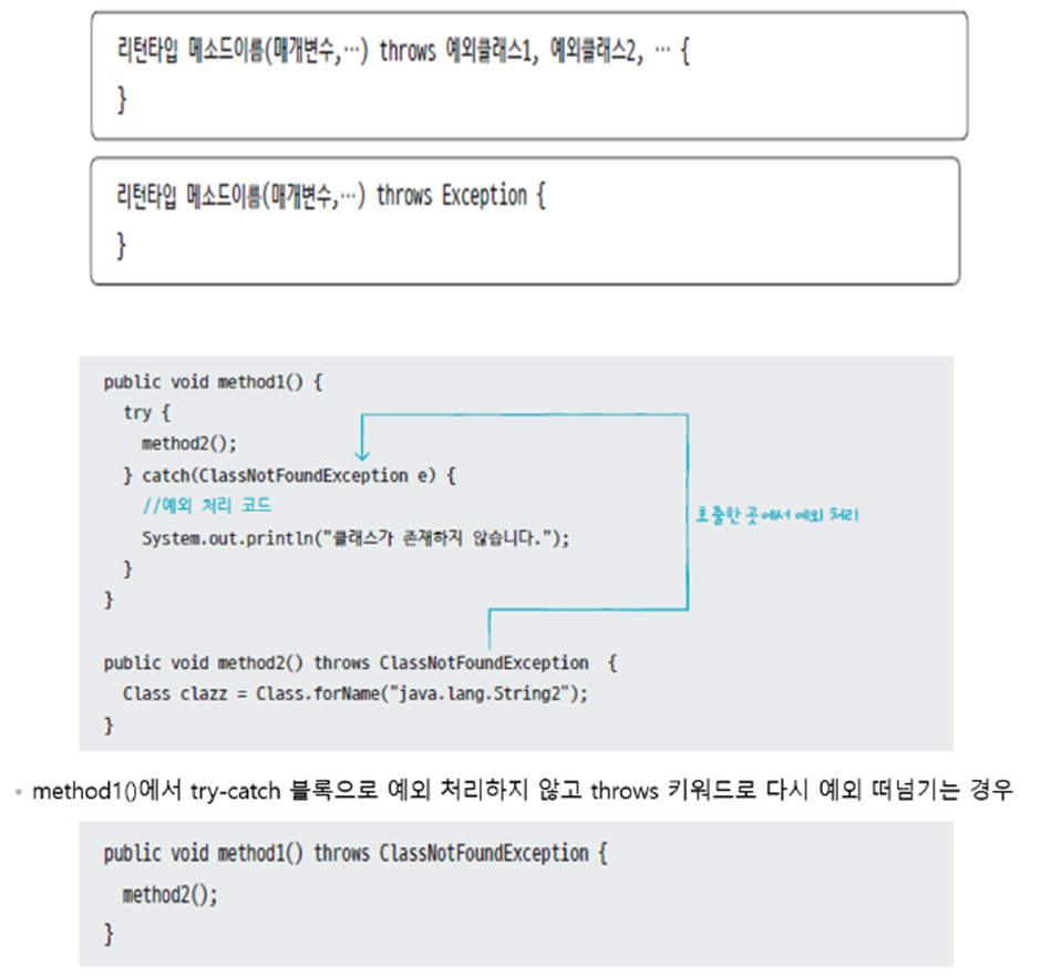 throws 키워드로 메소드에서 처리하지 않은 예외를 호출한 곳으로 넘길 수 있다