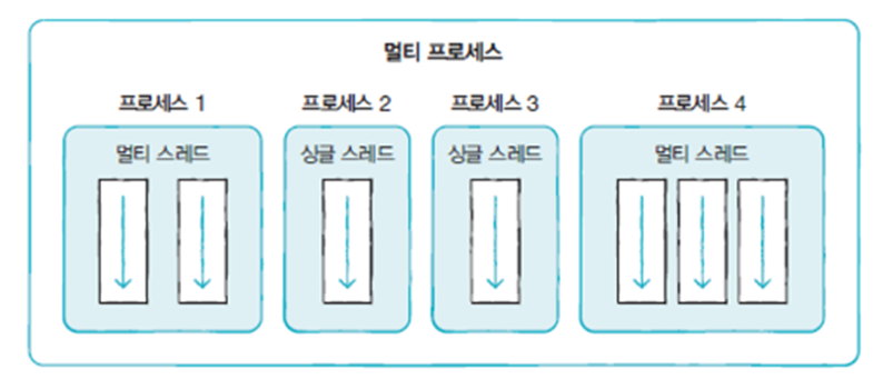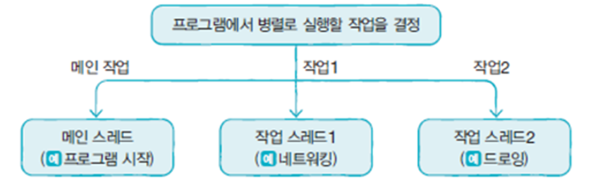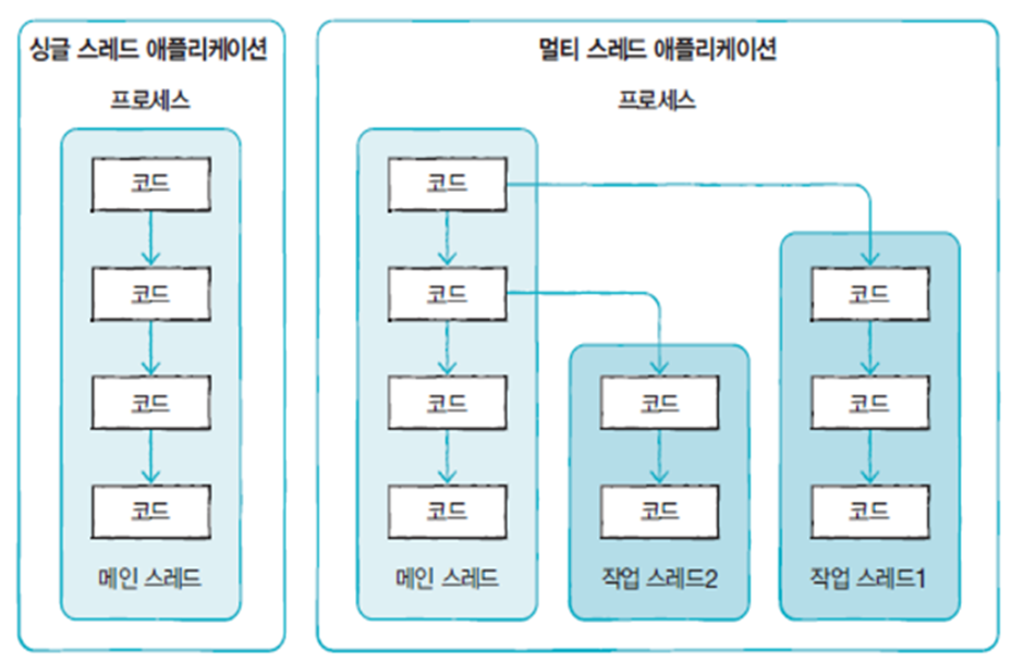 운영 체제는 CPU 및 메모리 자원을 병렬로 할당하는 멀티 태스킹이 가능한데, 각 프로세스는 순차적으로 실행할 코드 이름인 스레드(thread)를 병렬로 실행할 수 있다