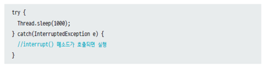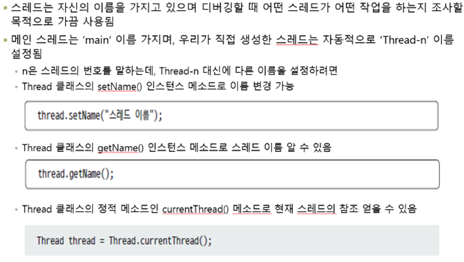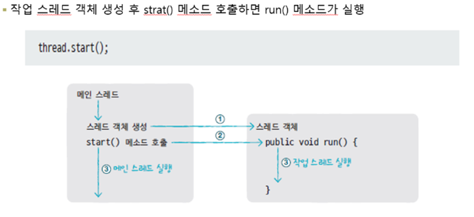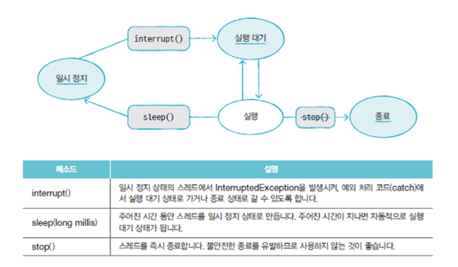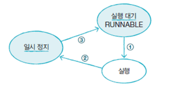- 실행(running) 상태: 실행 대기 상태의 스레드 중 운영체제가 하나를 선택해 CPU가 run() 메소드를 실행한 상태로 메소드를 모두 실행하기 전에 다시 실행 대기 상태로 돌아갈 수도 있음