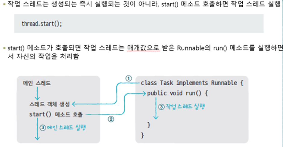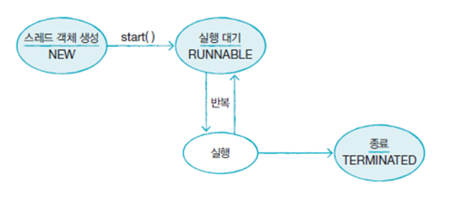 - 실행 대기(runnable) 상태: 스레드 객체를 생성 후 start() 메소드를 호출한 직후의 상태