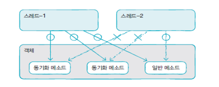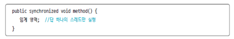 - 동기화(synchronized) 메소드: 스레드가 객체 내부의 동기화 메소드를 실행하면 즉시 객체 잠금