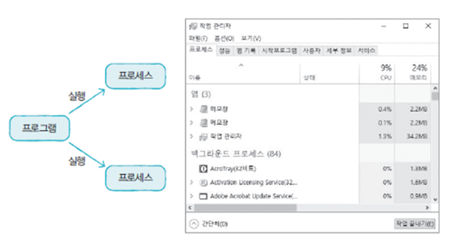 실행 중인 하나의 애플리케이션을 프로세스(process)라고 하며, 애플리케이션이 실행되면 운영체제로부터 실행에 필요한 메모리를 할당 받아 코드를 실행한다