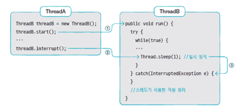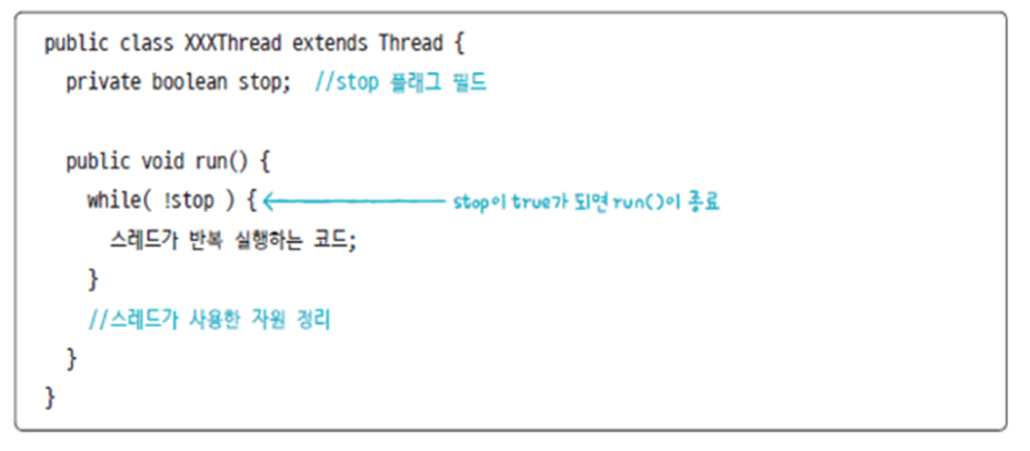 - 종료(terminated) 상태: 실행 상태에서 run() 메소드가 종료되어 스레드 실행이 정지된 상태