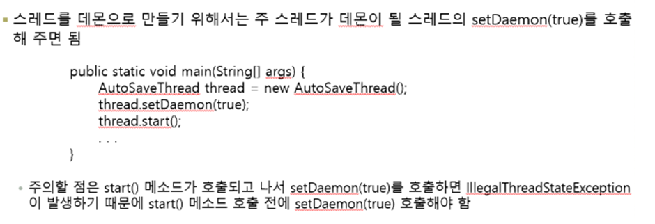 주 스레드의 작업을 돕는 보조 스레드를 데몬 스레드라 하며, 주 스레드 종료 시 같이 종료된다
