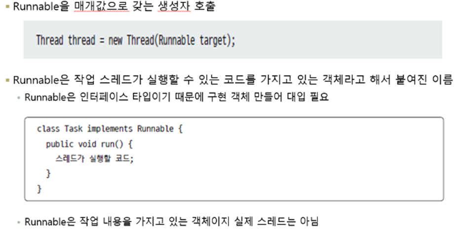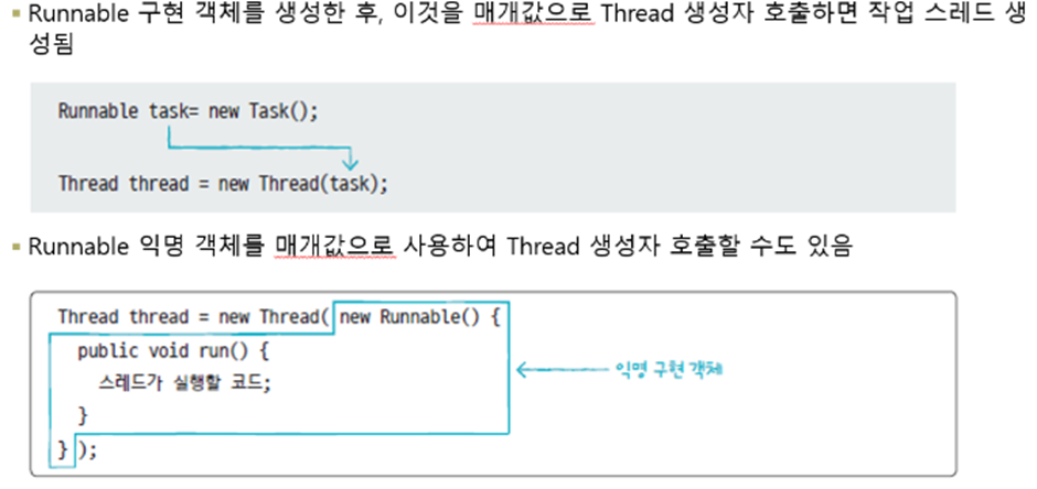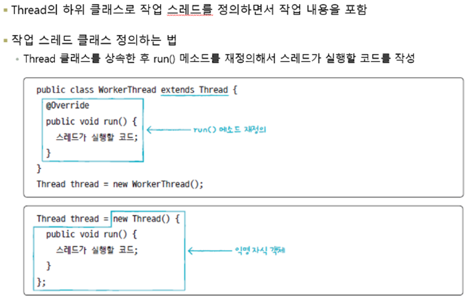 멀티 스레드 애플리케이션을 개발하려면 몇 개의 작업을 병렬로 실행할 지 결정한 뒤 각 작업별로 클래스를 상속/생성해서 작업 스레드를 객체화해 사용해야 한다