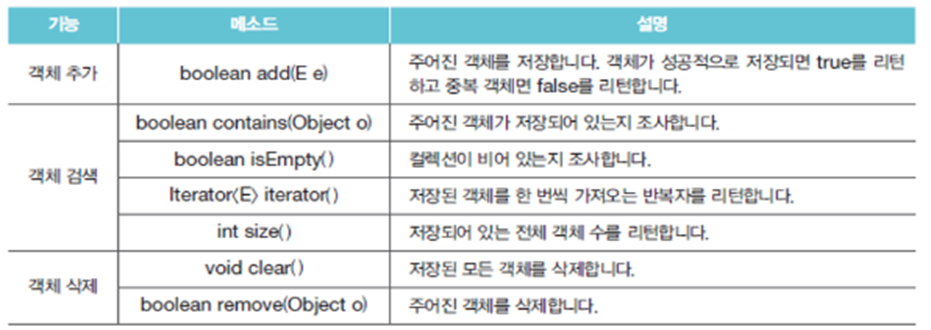 - 객체를 중복하여 저장할 수 없고 하나의 null만 저장 가능