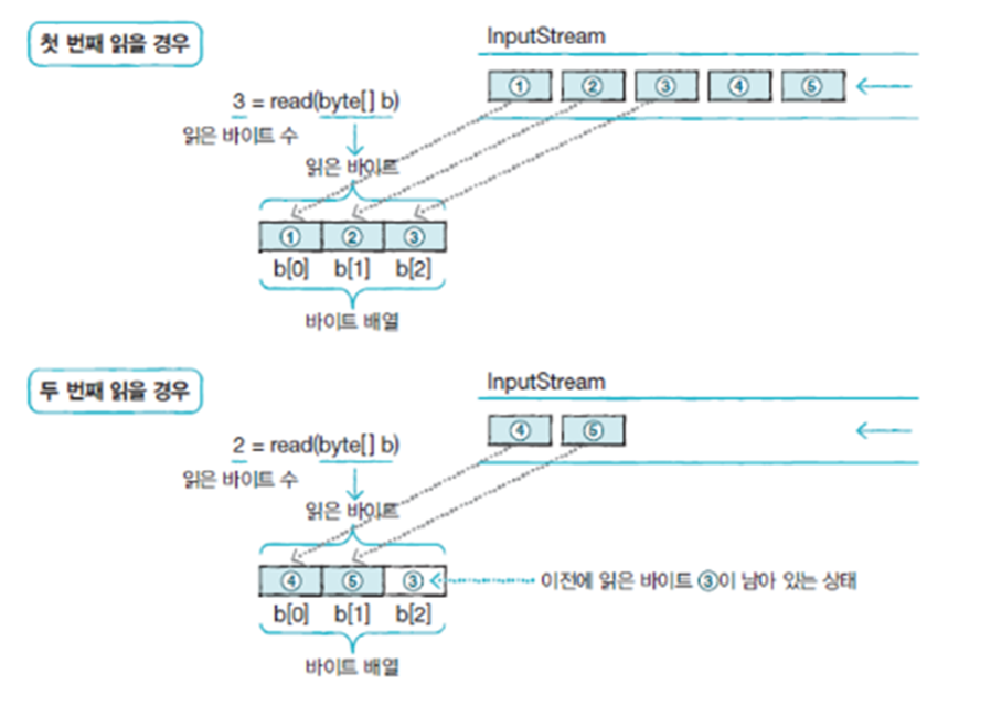 주어진 배열의 길이만큼 바이트를 읽고 해당 배열에 저장해 반환하는 read(byte[] b) 메소드주어진 배열의 b[off] 부터