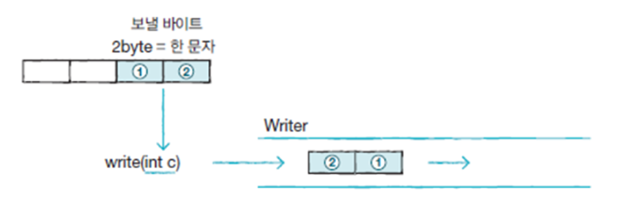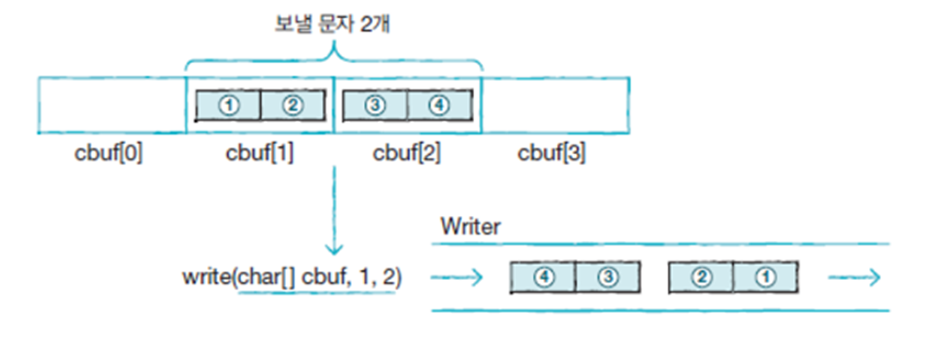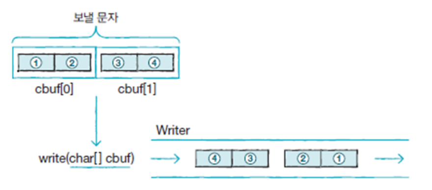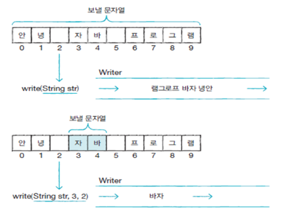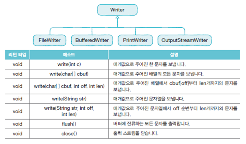 모든 문자 기반 출력 스트림 클래스는 Writer 클래스를 상속매개 변수의 int(4byte)에서 끝 2byte(1개 문자)만 출력 스트림으로 보내는 writer(int c) 메소드매개 값 char[] 배열의 모든 문자를 출력 스트림으로 보내는 write(char[] cbuf) 메소드매개 값 배열의 char[off] 부터 len 개의 문자를 보내는 write(char[] cbuf, int off,