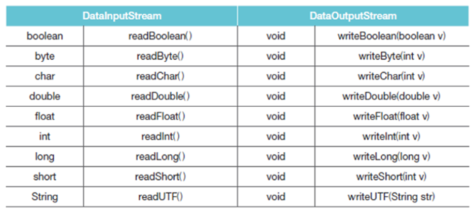 입출력 스트림에 연결해 기본 타입 입출력 가능기본 타입 입출력 보조 스트림 제공 메소드 (데이터 타입 별 크기가