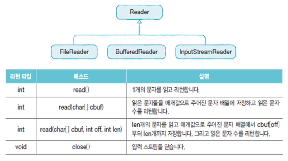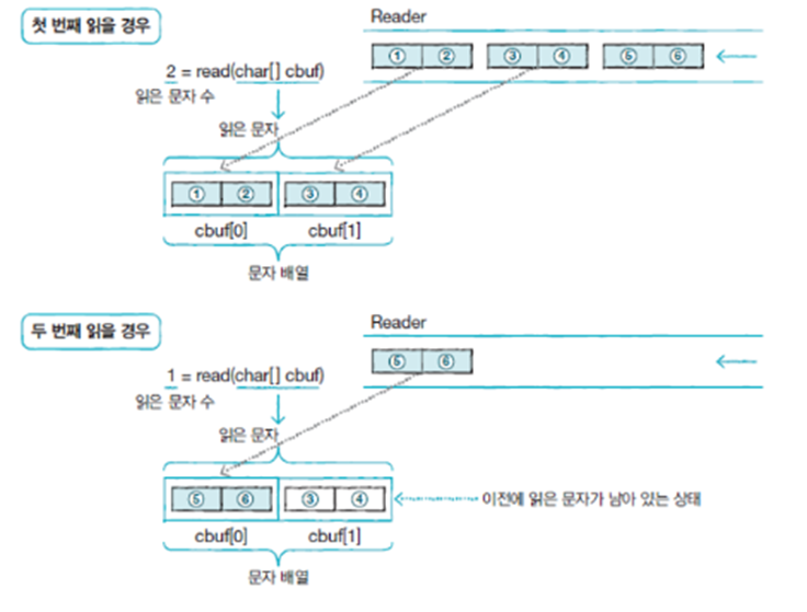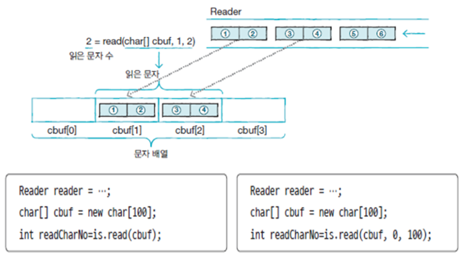 read(char[] cbuf) 메소드배열에 cbuf[off] 부터 len개 문자 저장, len 값을 반환하는 read(char[] cbuf, int off, int len) 메소드