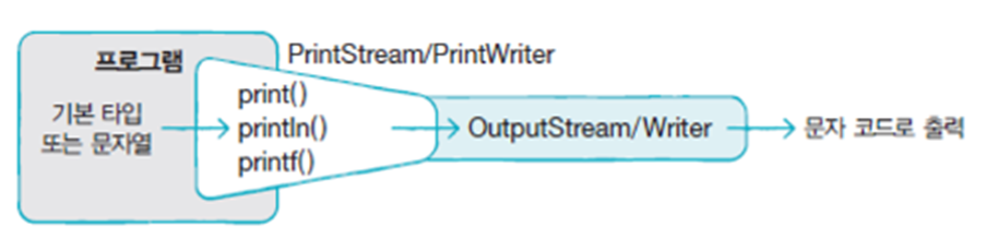 PrintStream & PrintWriter: 바이트 & 문자 기반 출력 스트림과 연결해 프린터와 유사하게 출력출력 데이터 타입에 따른 오버로딩 (println() 메소드는 개행
