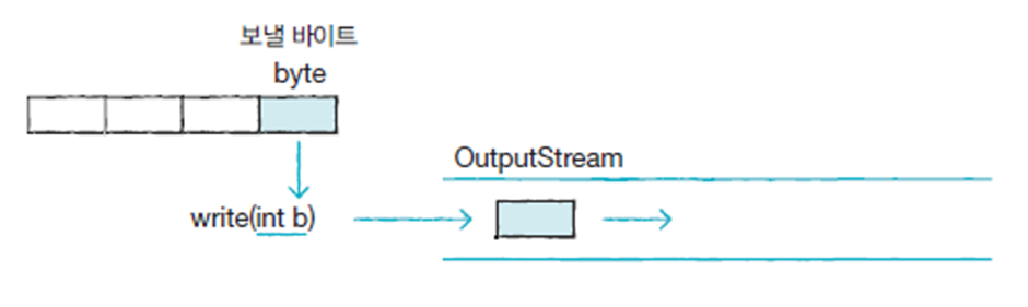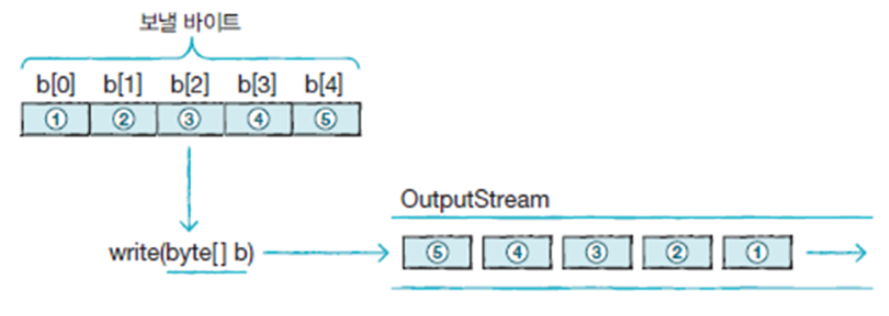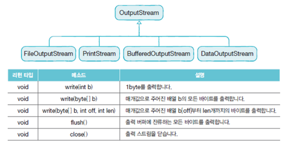 클래스를 상속매개 변수로 주어지는 int(4byte)에서 끝 1byte만 출력 스트림으로 보내는 write(int b) 메소드매개 값 배열의 모든 바이트를 출력 스트림으로 보내는 write(byte[]