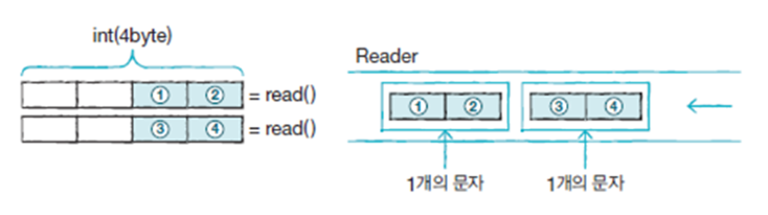 모든 문자 기반 입력 스트림 클래스는 Reader 클래스를 상속입력 스트림으로부터 1개의 문자(2byte)를