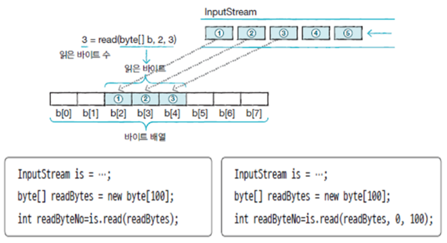 주어진 배열의 길이만큼 바이트를 읽고 해당 배열에 저장해 반환하는 read(byte[] b) 메소드주어진 배열의 b[off] 부터