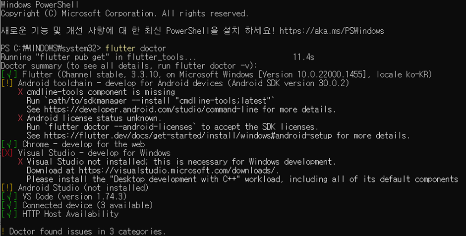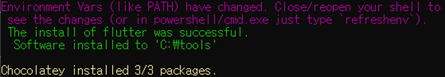 - chocolatery 설치 후 관리자 권한 powershell에 choco install flutter 입력