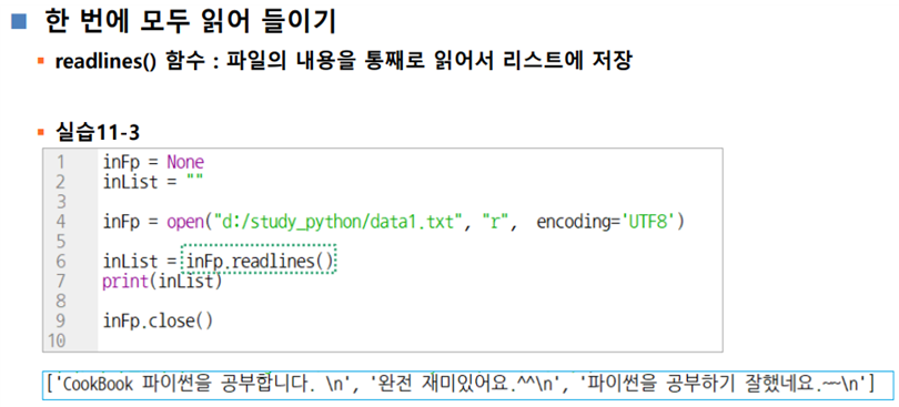 -> readlines() 함수로 모두 읽어 들여 리스트로 저장