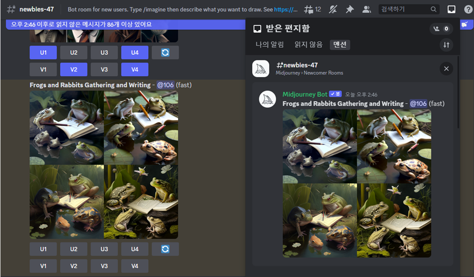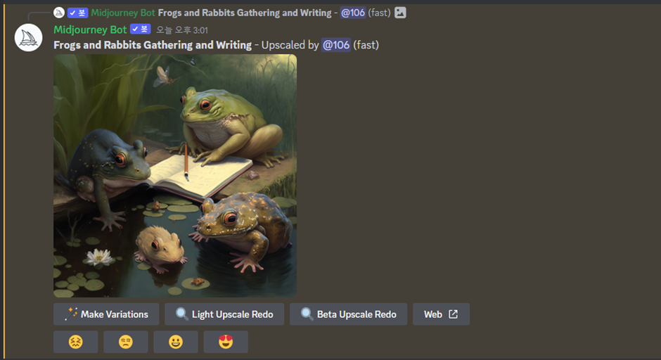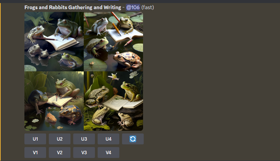?? 왜인지 토끼는 없고 개구리들만 가득한 그림이 나왔습니다. 여기서 9개의 선택지가 주어지는데, 좌측 상단부터 1~4번 그림이며 U는 Upscale(퀄리티 상승) V는 Variation(약간의 변조), 🔁는 완전히 새로 생성을 의미합니다. 중복 선택도 가능합니다