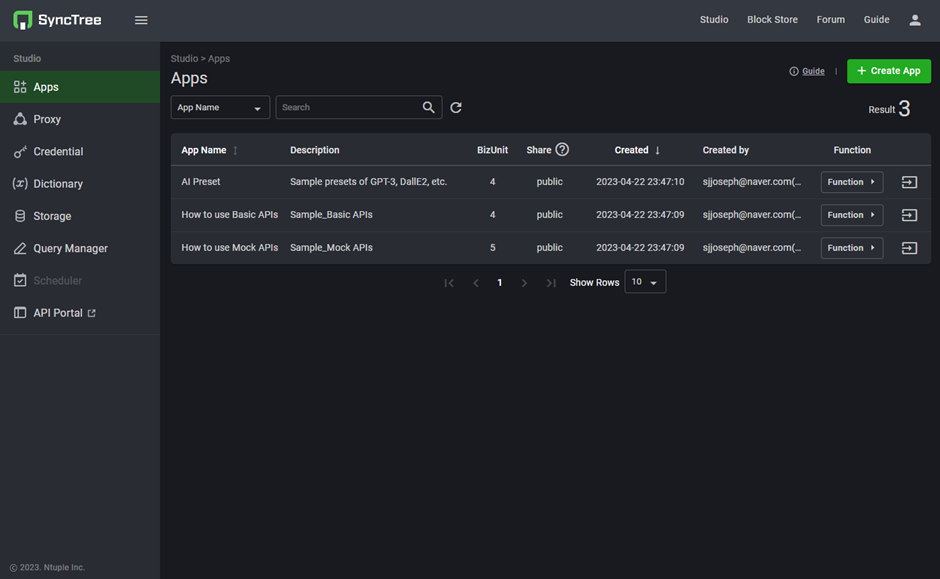 - Apps: 블록 코딩 형태의 API인 BizUnit을 App으로 그룹화하여 관리