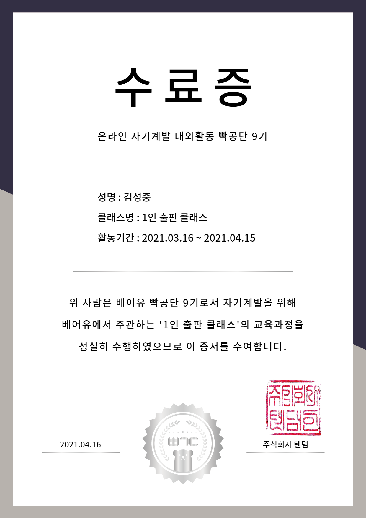 | [빡공단 9기/1인출판] #3 출판 제작 (0) | 2021.04.13 |