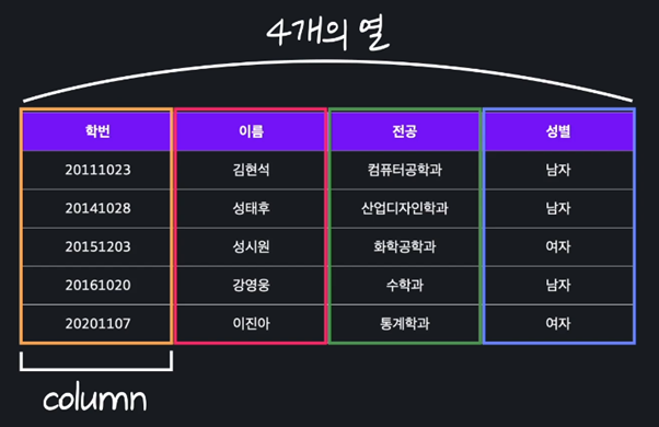 column(열): 개체가 가지는 하나의 속성을 나타내는 세로줄