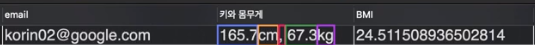 SELECT email, height, weight, weight / ((height/100) * (height/100)) FROM copang_main.member;