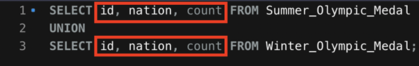 UNION -> 교집합이 존재하는 같은 종류의 두 테이블을 합칠 때 사용!