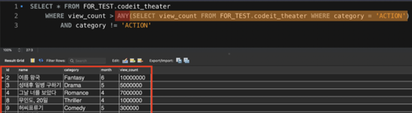 ANY(=SOME): 서브쿼리 row값 중 단 하나의 값이라도 만족하면 TRUE