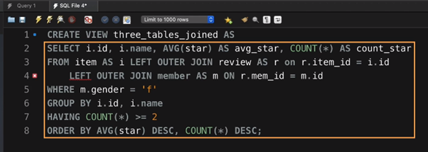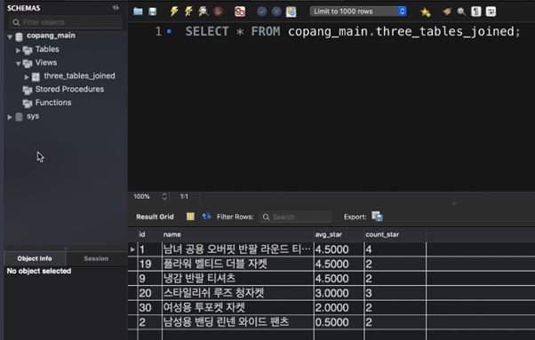 뷰(View): 조인 등의 작업을 통해 만든 ‘결과 테이블’을 다른 쿼리창에 가상으로 저장한 형태