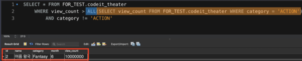 ALL: 서브쿼리 row값 모두 만족해야 TRUE