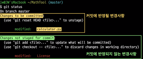 - Modified 상태: 최신 커밋과 비교했을 때 조금이라도 바뀐 내용이 있는 상태